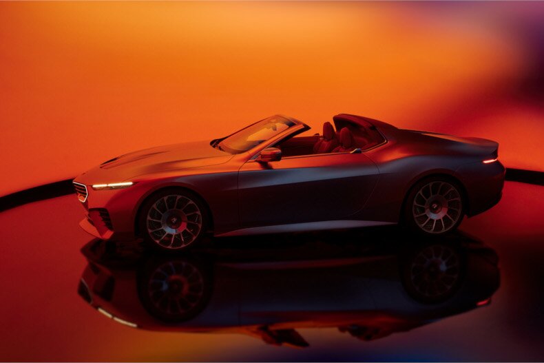 Při pohledu z ptačí perspektivy zaujme výrazná široká kapota, ikonická přední část BMW připomínající žraloka s podsvícenou maskou chladiče ve tvaru ledvinek a seseknutá záď. Pečlivě vybrané odkazy na legendární roadster BMW Z8 jsou ihned zřejmé. Obzvláště nápadný je výrazný prolis, který se táhne od kapoty přes interiér až k hliníkové liště umístěné na víku zavazadlového prostoru a zdůrazňuje celkově dynamickou siluetu vozu.